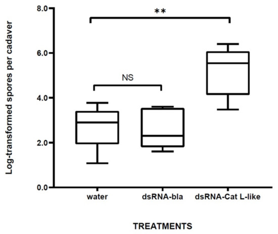 Relationship between Btk reproduction within the insect and RNAi treatment. Data are log-transformed spore counts per cadaver. Bars represent means ± SE. Analysis of variance (ANOVA) in conjunction with a post hoc Tukey–Kramer multiple comparison test was performed to determine differences among treatments. ** p < 0.01; NS—not statistically significant.