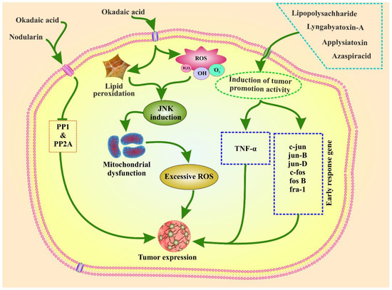 Phytoplankton toxins can promote tumor growth and ROS-induced toxicity in animals. The mechanism of tumor-promoting activity of the toxins is shown in Figure 2. Phytoplankton toxins trigger ROS production. ROS generation by microcystins has been examined in the context of the c-Jun N-terminal protein kinase (JNK) pathway. JNK activation causes mitochondrial failure, which leads to hepatocyte apoptosis and liver injury in rats, and has been demonstrated to occur in the presence of microcystins and okadaic acid [78,105,106]. Aplysiatoxin, nodularin, lyngbyatoxin A, LPS, AZA, and okadaic acid derived from phytoplankton have the potential to promote tumor growth. Similar to microcystins, nodularin also promotes tumors in the liver, skin, and glandular stomach of mice, which also inhibits PP1 and PP2A and triggers tumor initiation [17,18,19]. In animal studies, nodularin can promote the production of tumor necrosis factor-α (TNF-α) and induce early response genes, namely, jun B, jun D, c-fos, c-jun, fos B, and fra-1 in the rat liver. This induction leads to tumor expression. Moreover, TNF-α has been proposed as an endogenous tumor promoter involved in human cancer development and it can trigger tumor promotion in humans [18,19].