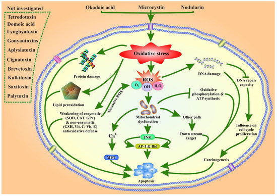 Okadaic acid (OA), microcystin and nodularin are involved in oxidative stress and the generation of reactive oxygen species (ROS), resulting in several toxicities to organisms. The toxins induce oxidative stress, damage macromolecules such as proteins, lipids, and DNA, and inhibit protein folding activity. It also decreases the activity of DNA repair enzymes that influence cell cycle proliferation and trigger carcinogenesis. OA and nodularin weaken the enzymatic and non-enzymatic antioxidant enzymes, triggering apoptosis and excessive ROS production. ROS generation has also been examined in the context of the JNK pathway leading to apoptosis via activating downstream transcription factors AP-1 and Bid. ROS causes mitochondrial dysfunction, induces the mitochondrial permeability transition (MPT) pathway, a Ca2+ dependent pathway, and triggers apoptosis. Mitochondrial dysfunction inhibits oxidative phosphorylation and ATP synthesis, which finally causes apoptosis. Eventually, ROS enters other pathways and triggers apoptosis.