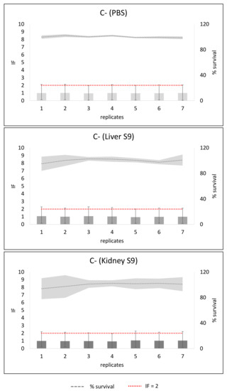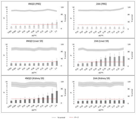 The results of the positive controls 4-nitroquinoline-N-oxide (4NQO) and 2-aminoanthracene (2AA) without metabolic activation (PBS) and with metabolic activation from liver (liver S9) or from kidney (kidney S9) are presented in Figure 2. 4NQO without metabolic activation has IF values greater than 2 at high concentrations (0.63–2.5 µg/mL) with a concentration–response tendency. In the presence of liver S9, a positive result was only observed at the highest concentration (2.5 µg/mL), but with kidney S9, a strong genotoxic effect with a concentration–response trend was registered. Moreover, the highest concentration had IF values around 6 (Figure 2). IF variability was greater with kidney S9 (max % CV: 62.9) than with liver S9 (max % CV: 50.6). Considering 2AA, it was negative without metabolic activation and with kidney S9. However, it was positive with liver S9, showing a concentration–response tendency and reaching IF values around 4 (Figure 2). IF variability was greater with kidney S9 (max % CV: 66.7) than with liver S9 (max % CV: 45.8).