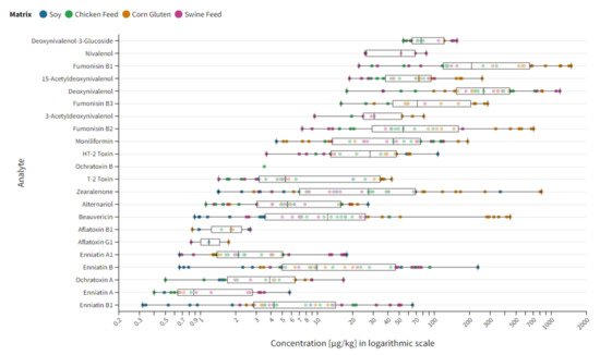 ISO 17025-accredited laboratories need to provide a validation for their analytical methods. Detailed requirements for method validation are listed in the standard [12]. ISO 17025-accredited laboratories are also required to ensure the validity of their results by recording data in such a way that trends are detectable, and by monitoring their performance, specifically the data trueness, by comparing their results with those of other laboratories by participating in proficiency testing (PT) or other interlaboratory comparison studies [12]. Organizations providing proficiency testing offer a broad variety of mycotoxin-contaminated matrices. However, these proficiency testing schemes typically focus on regulated mycotoxin–matrix combinations with a limited variability regarding complex matrices and emerging mycotoxins. As an example, De Girolamo et al. (2014) conducted such a proficiency testing study for mycotoxins with 18 participants from 10 countries, analyzing the regulated fungal metabolites aflatoxin B1, aflatoxin B2, aflatoxin G1, aflatoxin G2, deoxynivalenol, fumonisin B1, fumonisin B2, zearalenone, T-2 and HT-2 toxins, and ochratoxin A in maize and deoxynivalenol, zearalenone, T-2 and HT-2 toxins, and ochratoxin A in wheat with LC-MS/MS [3]. Another interlaboratory collaboration study was conducted by Sibanda et al. in 2021 by testing the applicability of diagnostic biochip arrays for 7 regulated mycotoxins in complex feed material, including, inter alia, dairy feed, dried distillers’ grains with solubles (DDGS), dog food and poultry feed [13]. Both studies demonstrated the applicability of either analytical reference methods as well as rapid test systems for regulated mycotoxins in common and challenging matrices. Although these results provide relevant information on the use of routine multi-mycotoxin methods, data on the applicability of analytical approaches exceeding the current regulatory scope are rather scarce. In addition, common PTs are focusing on a single target value per analyte–matrix combination and do not provide insights in the applicability of a method for a broad concentration range in a specific matrix commodity group.