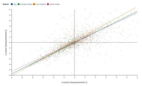 A graphical overview of all z-score data calculated in this study is depicted in Figure 2. In this graphic, the replicate measurements (n = 2) for each lot are opposed and a product-moment (Pearson) correlation was conducted. The Pearson correlation is expressed as r and reflects the strength of the linear relationship of continuous variables (x and y vary together). Based on that, a very high correlation (size of r between 0.90 and 1.00) was obtained for all matrices with a correlation coefficient of 0.98 for soy, 0.95 for chicken feed and 0.90 for both corn gluten and swine feed [17]. With a Pearson correlation coefficient of 0.97, the 1439 data points for compounds currently subject to regulation have greater consistency than non-regulated substances; these had a Pearson correlation of 0.92 at 1506 data points. Less routine measurement of this substance class could be a possible reason for the lower consistency in repeated analysis. Furthermore, the outcome of the correlation analysis additionally proves the homogeneity of the sample material and highlights the consistency in replicate measurements.