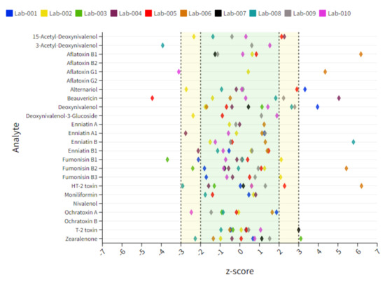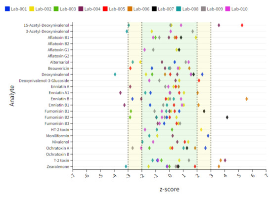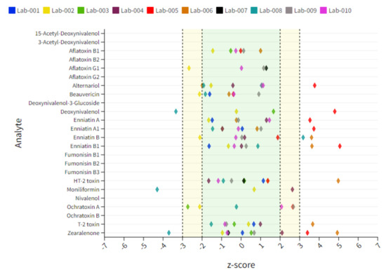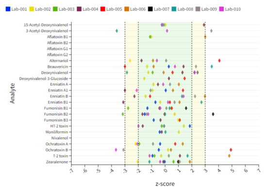 Soy samples contain the lowest number of positive findings and thus the lowest number of statistical evaluable data points. Arrows pointing vertically up or down indicate unacceptable results, while arrows pointing at a slight angle indicate questionable results. The target z-score range of ±2 as the criterion for successful participation was not reached for BEA (↘) and ENN-B (↘) for Lab 2 showing a slight underestimation of these compounds. Lab 4 showed, in contrast, a trend in overestimating BEA (↑) as well as a minor overestimation of ZEN (↗), whereby two of ten reported results are the main reason for the deviation of the target z-score. A clear overestimation was shown for ENN-Bs (↑) and ZEN (↑) for Lab 6. Some laboratories also show questionable or unacceptable results for several compounds as in the case of Lab 2, Lab 5, Lab 6 and Lab 7 for AFB1, AFG1, AOH, DON, enniatins (ENNs), HT-2, T-2 or ZEN. However, in these cases, only a small number of data points were given, and therefore a clear statement to the analyte–matrix-specific performance cannot be made. Therefore, a sum interpretation was only conducted when a minimum of 6 reported z-score data points were available. An overview of the individual lab performance based on average z-score values is depicted in Figure 3. An overview of all z-score data including those which exceed the range of ±7 is captured in Table S6.