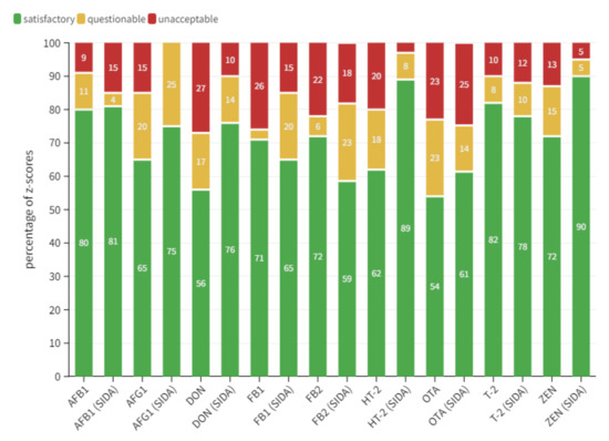 - An overall value of 70% for satisfactory z-score results within ±2 proves that all participating laboratories delivered accurate data which are fit for purpose for official control of regulated toxins as well as emerging mycotoxins, even in complex matrix material. The applied methods also proved their applicability in a broad concentration range, from high to trace contaminations [3].
