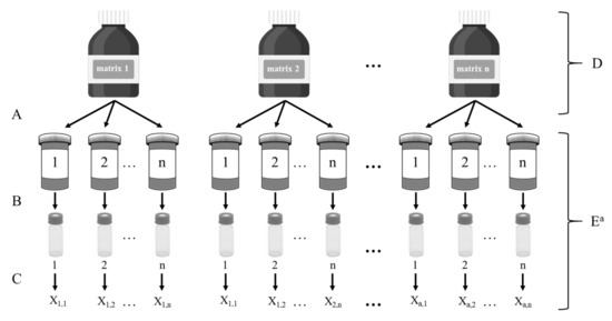 Layout of the between-unit homogeneity study (A = subsampling; B = preparation; C = measurement; D = contributes to the observed between unit variation; E = operations contributing to observed within-unit variation).