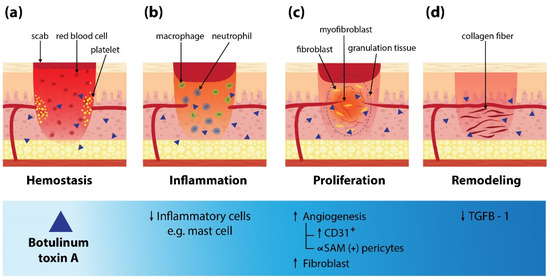 Normal physiologic wound healing is a dynamic process consisting of different continuous, overlapping, and precisely programmed phases [1,3,11]. Any disruption in the process leads to abnormal wound healing or chronic unhealed ulcers [12]. Our literature review found BoNT-A can enhance wound healing in various types of ulcers. Several studies that investigated mechanisms of BoNT-A on wound healing found that BoNT-A decreased inflammatory cell infiltration during the inflammatory phase [25,26,27]. Inhibition of mast cell degranulation and reduction in number were reported [19,28]. Reduction in vascular permeability and exudation of neutrophils and macrophages were also observed. Consequently, pus deposition on ulcers was reduced [29]. Furthermore, during the proliferative phase, it could enhance blood flow and promote vascular sprouting by increasing expression in CD31+, ∝SAM (+) pericytes, as well as fibroblasts [30,31,32,33]. It could be due to a reduction of reactive oxygen species (ROS) release and endothelial nitric oxide synthase (eNOS) in the hypoxic area [30,34]. Altogether, granulation tissue was created and filled the wound. It also can inhibit releasing norepinephrine resulting in vasodilatation and increasing oxygenation to the wound [20]. In the period of the remodeling phase, lower expression of TGF-β1 by BoNT-A was found which reduces the risk of fibrosis and scar formation [29]. Figure 1 shows a mechanism of BoNT-A in wound healing for comprehensive understanding.