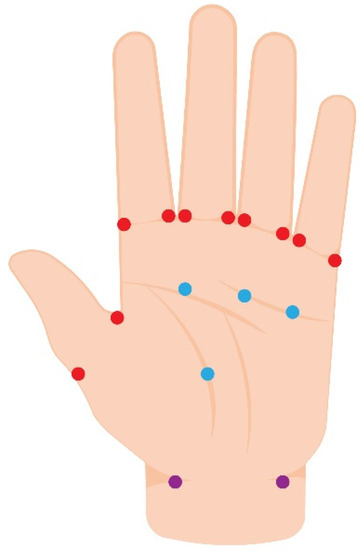 The BoNT-A injection patterns for Raynaud’s phenomenon-associated ulcer. Red dots represent the base of the digit injection pattern. Blue dots identify the palmar injection pattern. Purple dots identify the proximal hand injection pattern.