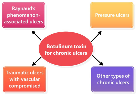 To date, a standard guideline for BoNT-A injection for chronic ulcers has not been established yet due to a lack of strong evidence that supports the efficacy of BoNT-A for skin ulcers. Based on the available data, BoNT-A might be offered to patients with chronic skin ulcers due to vascular compromise (i.e., RP-associated ulcers, pressure ulcers with vascular compromised), traumatic ulcers, etc. (Figure 3). BoNT-A for RP-associated ulcers seems to be the most promising efficacy and established treatment method. Nevertheless, its harmlessness and ubiquity make it worth trying for those chronic ulcers that failed standard therapy. Adverse effects were mild and temporally, an intrinsic hand muscle weakness has been reported which resolved completely within 5 months [41,43,49,50]. In terms of point of injection, our recommendation is to consider the type of ulcer including (1) ischemic ulcers: inject toward neurovascular bundles for vasodilation [41,42,43,46,49,50,51]; (2) pressure ulcers: inject into contracted and spastic muscles for muscle relaxation; and (3) other types: inject around the ulcer to optimize wound environment [53,63]. Dosage and reconstitution should be considered individually depending on wound size or volume of muscle.