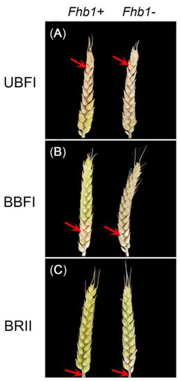 FHB severity of the Fhb1 near-isogenic lines at 21st day after inoculation under the three inoculation methods. (A–C) Contrasting FHB symptoms of Fhb1 NILs under the UBFI, BBFI, and BRII methods, respectively. The wheat spike with Fhb1 on the left showed a significantly lower level of FHB severity than the corresponding spike without Fhb1 on the right under each method. The red arrows point to the inoculation sites. The inoculum was injected into the bilateral florets of a spikelet under the UFBI and BBFI methods, and BRII inoculation was performed by injecting into the basal rachis internode.