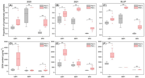 Among the three methods, the maximum, mean and range of DON content under UBFI method were consistently the largest across the two years (Table S1 and Figure S1D,E), and the mean DON content exceeded 1000 μg∙kg−1 (Table S1). In contrast, mean DON content of the NILs under BRII method was lower than those of the other two methods in each year (Table S1). A smaller variation of DON content was observed in 2021 than that in 2020 (Figure S1D,E), but the mean value in 2021 was higher (Table S1). Correlations of DON content in grains between the two years were significant (p < 0.05) only under UBFI method, but not significant under the other two methods (p > 0.05).
