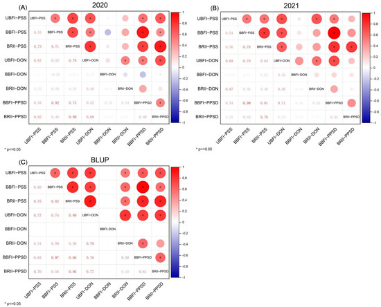 The Pearson’s correlation coefficients for proportion of symptomatic spikelets (PSS), deoxynivalenol (DON) content and proportion of premature spike death (PPSD). (A) Year 2020. (B) Year 2021. (C) Predicted PSS, DON content, and PPSD by best linear unbiased prediction (BLUP). The red and blue circles on the upper right-side indicate significant positive and negative correlations, respectively, and are marked inside with ‘*’ at p < 0.05, and the empty cases refer to insignificant correlations. The color gradient is proportional to the correlation coefficient. The correlation coefficients are marked on the corresponding lower left-side.