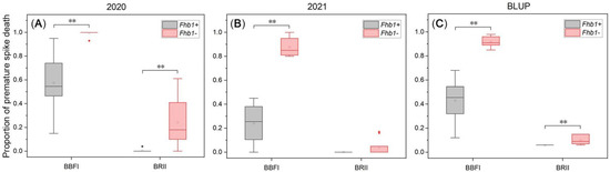 One-way ANOVA analysis of PPSD showed that there was a highly significant difference (p < 0.01) between the two groups with contrasting Fhb1 alleles across the two years under the BBFI method, and the lines without Fhb1 were close to or equal to 1.0 (Figure 4 and Table 1). PSD also occurred in some lines with Fhb1, but significantly less than those lines without Fhb1. PPSD under the BRII method was significant at p < 0.01 between the two groups in 2020, but not significant in 2021 (Figure 4). PPSD of the lines carrying Fhb1 were close to 0.0 under the BRII method (Figure 4 and Table 1), indicating that PSD under the BRII method tended to segregate in a qualitative manner. The BLUP values of PPSD over the two years showed a significant positive correlation between the BBFI and BRII methods (p < 0.05) (Figure 3), and BBFI caused more prematurely dead spikes than BRII did with a differential BLUP value up to 0.49 between the Fhb1− and Fhb1+ groups (Table 1). These results indicated that PPSD under BBFI could be an alternative index for phenotypic assessment of FHB severity and an optimal index to assay the genetic effect of Fhb1.