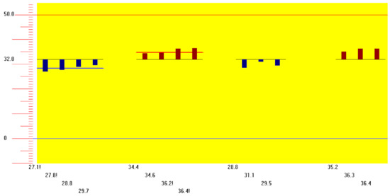 Warm and cold sensation thresholds, in our patient, showed mild small-fibers impairment while cold and heat pain thresholds were significantly lowered, consistently with thermal hyperalgesia. The vertical axis shows temperature (°C). The horizontal axis shows the temperature at which the patient refers to, from the left to the right, cold sensation (blue), warm sensation (red), cold pain (blue), and heat pain (red); the exclamation point “!” means the temperature sensation is over the normality threshold. The mean value for the cold sensation threshold: 28.3 °C; The mean value for the warm sensation threshold: 35.4 °C. The mean value for cold pain: 29.8 °C; The mean value for heat pain: 35.9 °C.