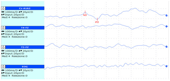 Left hand averaged LEP of our patient: latency of N2 = 329 m; latency of P2 = 427 ms. The N2-P2 vertex complex (which is the most common waveform complex used to assess LEP) is clearly altered (latency normative values for solid-state lasers [15]: N2 < 252 ms; P2 < 415 ms) and detectable from the background noise.