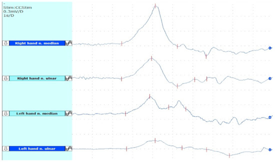 Electric SSR from upper limbs of our patient; this test evaluates the integrity of the sudomotor cholinergic postganglionic fibers. The test is pathological when there is an absent response or when there are clear asymmetries [16]. From top to bottom: the first two traces show right-hand responses. After median nerve stimulation: latency = 2459 ms; amplitude = 1.03 mV; after ulnar nerve stimulation: latency = 2452 ms; amplitude = 0.43 mV. The last two traces show left-hand responses. After median nerve stimulation: latency = 2649 ms; amplitude = 0.26 mV. After ulnar nerve stimulation: latency = 2710 ms; amplitude = 0.19 mV. The response is present bilaterally but the traces in the left hand are slightly prolonged and the amplitudes are reduced in comparison with the right hand.