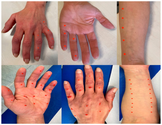 The upper half of the figure shows the sites treated with 50 IU of BoNT/A with 2 mL of 0.9% sodium chloride dilution in the first session; 2.5 IU per site in the hand and 5 IU per site in the forearm. The lower half of the figure shows the sites treated with 80 IU of BoNT/A with 2 mL of 0.9% sodium chloride dilution for the forearm and 4 mL for the hand in the following session; 2.5 IU per site in the forearm and 1.25 IU per site in the hand. The red dots indicate the sites of the injections.