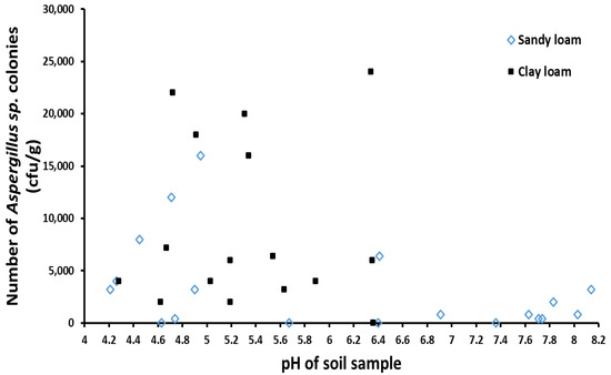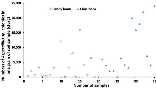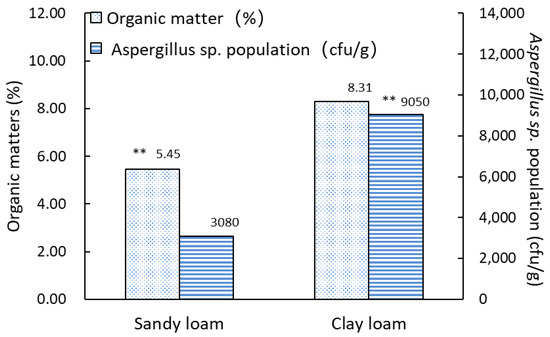 While the level of organic matter showed an extremely significant difference (p = 0.001) between sandy loam and clay loam samples, which might be related to the difference between Aspergillus sp. populations in two soil types. It can be seen from Figure 6 that the sandy loam samples had less organic matter than the clay loam samples, with 5.45% and 8.31%, respectively. Likewise, the mean propagule density of Aspergillus sp. in sandy loam samples was 3080 cfu/g, much lower than that in clay loam samples.