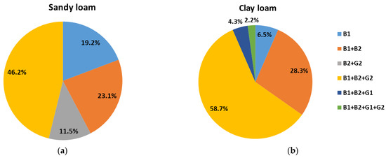 As shown in Figure 2, there were some differences in the distribution of toxigenic types of Aspergillus isolates between sandy loam and clay loam. On the whole, the strains producing AFB1, AFB2 and AFG2 accounted for the highest proportion in both types of soils, with 46.2% and 58.7%, respectively (Figure 2). These were followed by strains producing AFB1 in sandy loam and strains producing AFB2 in clay loam, with 23.1% and 28.3%, respectively (Figure 2). The percentage of Aspergillus sp. isolates only producing AFB1 in sandy loam was higher (19.2%) than that in clay loam soils (6.5%). The isolates producing both AFB2 and AFG2 were only found in sandy loam, while isolates producing both AFB1, AFB2 and AFG1 and A. flavus producing all four aflatoxins were only found in clay loam.