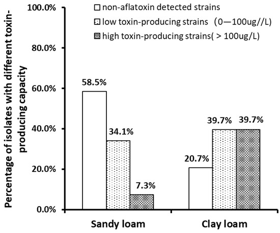 Aspergillus sp. isolated from the soil samples were cultured by the method described in Section 5.2.2, and then the content of aflatoxin in the culture solution was measured by LC. According to the toxin-producing level, Aspergillus isolates were classified into non-aflatoxin detected, low toxin and high toxin-producing strains, corresponding to the content of aflatoxin (AFT) of non-detected (N.D.), 0–100 μg/L and over 100 μg/L. The data in Figure 3 showed that the proportion of non-aflatoxin detected strains was higher in sandy loam samples than in clay loam samples. The proportions of low toxin-producing strains in clay loam (39.7%) and sandy loam (34.1%) were similar, while the differences in proportions of high toxin-producing strains in two types of soils were huge, with 39.7% in clay loam and 7.3% in sandy loam, respectively. It indicated the predominance of high toxin-producing strains in clay loam samples.