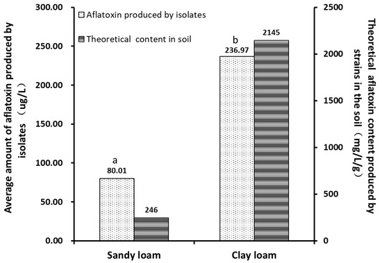 Toxin-producing capacity of Aspergillus isolates in sandy loam and clay loam. a, b indicate there is a significant difference between these two values.