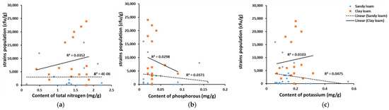 All soils samples were sent to a third-party testing institution (Wuhan Ziyu Testing Technology Co., Ltd. (Wuhan, China)) for detecting the major properties of soil. The results presented in Table 3 illustrated that there was no significant difference between sandy loam samples and clay loam samples in terms of the contents of total nitrogen, phosphorous and potassium. In addition, the R values presented in Figure 5 showed that the correlations between the contents of these three substances and Aspergillus sp. population were very low. Thus, the correlations of these properties and the propagation of strains were not attempted.