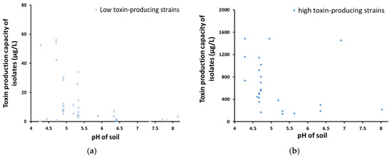 The relationship between the distribution of toxin-producing capacity of Aspergillus isolates and soil pH. (a) Toxin-producing capacity of low toxin-producing strains and soil pH; (b) toxin-producing capacity of high toxin-producing strains and soil pH.