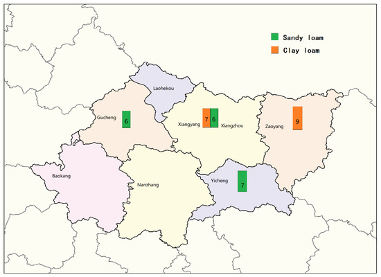 Soil samples were collected from 4 major peanut-producing areas in Xiangyang: Xiangzhou, Zaoyang, Yicheng and Gucheng. According to the actual distribution of peanut planting around the four main planting areas, we selected a total of 13 towns as sampling points, including two typical soil types which were clay loam from hilly land and sandy loam from the riparian zone. In the selected peanut planting area, soil samples were collected by using the five-point sampling method. Five subsamples were mixed into one sample and at least 3 samples were collected at each sampling point. The samples were collected by first brushing away the fallen leaves and deadwood on the top of land and taking the soil around the root interval about 10 cm deep. All the samples were marked according to the soil types after removing the large stones in the soil, and each sample was approximately 2 kg. At last, there were 35 soil samples collected in total, and the sampling distribution is shown in Figure 9. All the soil samples were collected during a peanut harvest period which is usually from the end of September to early October, in order to avoid differences of soil composition caused by the seasons.