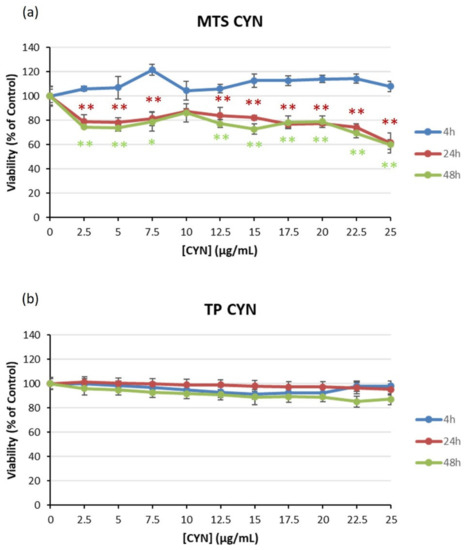 The effect of CYN on the viability of HEK293 cells. Viability was determined with the MTS assay (a) and TP (b) after exposure to 0–25 µg/mL CYN for 4, 24 and 48 h. Significantly different from the control group * p < 0.05 and ** p < 0.01.