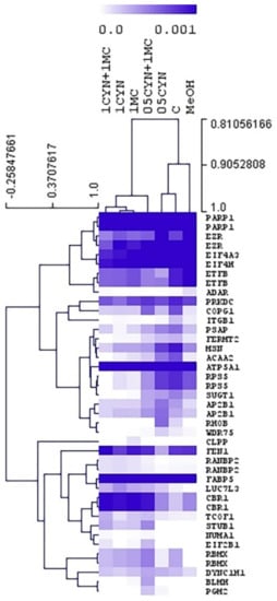 Analysis of HEK293 cells after exposure to cyanotoxins. The color map symbolizes the relative expression of proteins displaying quantitative variations among experimental groups (ANOVA, p < 0.01). Proteins are presented in lines and group samples in columns. Control group (C), MeOH (solvent control group), group exposed to Cylindrospermopsin (CYN), group exposed to Microcystin-LR (MC) and group exposed to the combination of Cylindrospermopsin and Microcystin-LR (CYN + MC). Numbers preceding group abbreviations indicate toxin concentrations.