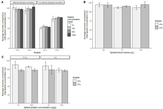 (A) Comparison between analyte recovery of OTA and OTα in pig feed with and without internal standard correction using 13C-labelled analytes. (B) Influence of the blood volume spotted on protein saver cards on the analyte recovery for OTA and OTα. (C) Comparison of analyte recovery of different sample amounts for chicken excreta. For extraction, 1 g or 0.1 g excreta were used.