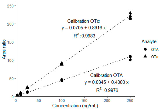 Linearity was assessed by preparing four individual calibration series through diluting defined concentrations of OTA, OTα, 13C-OTA, and 13C-OTα in ACN/water/formic acid (50/49/1 v/v/v) in the range from 0.25 ng/mL to 250 ng/mL. Linear regression was performed with a weighting factor of 1/analyte concentration, as recommended by Gu et al. [31]. The R2 was calculated and the acceptance criteria was set at R2 >0.99.