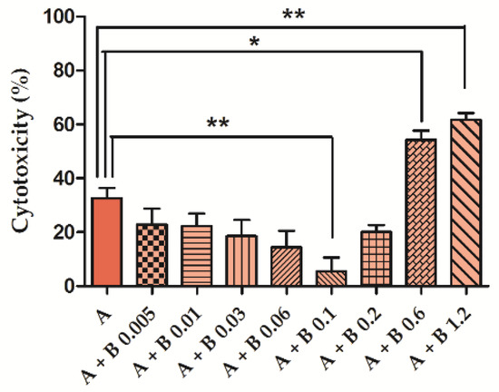 Once we defined the cytotoxicity of the two molecules taken individually, co-incubation experiments were executed using a fixed AFB1 concentration (81 µM) and BEN increasing concentrations. This co-incubation study showed that BEN might decrease AFB1 cytotoxicity in a dose-dependent manner and up to 0.1 mg/mL, where AFB1 mean cytotoxicity dropped from 32.6% to 5.5% (p < 0.01); however, BEN higher concentrations (0.6 and 1.2 mg/mL) significantly increase AFB1 cytotoxicity (p < 0.05 and p < 0.01, respectively; Figure 1).