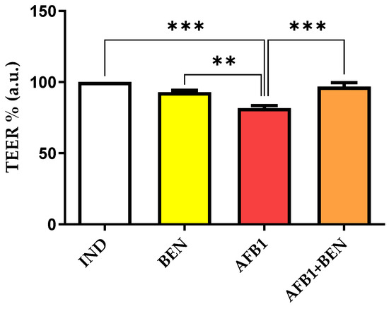 Different results were observed in IND cells. Although no differences in TEER were noticed between BEN and controls, cells exposed to AFB1 showed a significant decrease in monolayer integrity (p < 0.001). It is worth noting that this effect was reverted when cells were exposed to BEN and AFB1 in combination (p < 0.001; Figure 2).