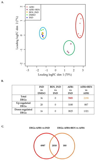 As shown in Figure 3A, the first dimension (x axis) explained most of the observed variability (i.e., 70%) and divided samples into three main groups. Aflatoxin B1 samples (i.e., red circle, Figure 3A) clustered far away from IND, DMSO and BEN_IND samples (i.e., blue circle) which, in turn, were closed to each other; interestingly, AFB1 + BEN samples (i.e., green circle) clustered in between of the two aforementioned clusters. The number of DEGs detected by the QLF-test are reported in Figure 3B; the complete output is reported in Table S3.