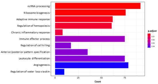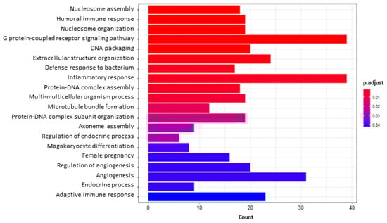Bar plot of the 20 most significant pathways as results of GO enrichment analysis of aflatoxin B1 (AFB1) + bentonite (BEN) vs. AFB1 down-regulated genes. X axis reports the number of genes representing each pathway. The color gradient corresponds to the level of significance that is adjusted with the false discovery rate method.