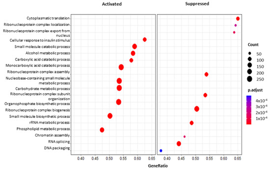 Dot plot of the 20 most significant pathways as results of GO GSEA of AFB1 + BEN vs. AFB1. Dot size represents the number of genes belonging to each pathway. The color gradient is related to the level of significance, adjusted with the Benjamini–Hochberg method. The box on the left collects activated pathways, while the box on the right the suppressed ones.