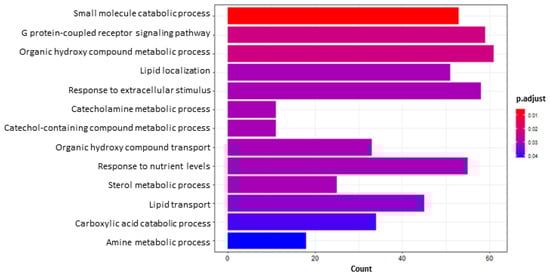 Looking in-depth into DEGs and pathways ideally considered as BEN responsive (when it is used as a reliever of AFB1 toxicity), a specific search on the 2018 DEGs shared between AFB1 vs. IND and AFB1 + BEN vs. AFB1 was performed. These “selective” approaches led to the enrichment of 13 GO terms (Figure 8), particularly the “response to extracellular stimulus” (GO:0009991, 58 genes).