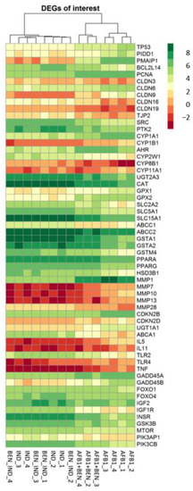 Notably, the metalloproteinase 7 (MMP7; LFCAvsI = 4.13, LFCABvsA = −1.47), the UDP glucuronosyltransferase family 1 member A1 (UGT1A1; LFCAvsI = 2.67, LFCABvsA = −1.72), ABCA1 (LFCAvsI = −3.63, LFCABvsA = 1.55), CYP8B1 (LFCAvsI= −2.98, LFCABvsA= 1.68), CYP26B1 (LFCAvsI = 1.98, LFCABvsA= −1.44), the cyclin dependent kinase inhibitor 2D (CDKN2D; LFCAvsI =2.12, LFCABvsA = −1.27) and CDKN2B (LFCAvsI = 1.23, LFCABvsA = −1.15) belonged to this pathway. We also found DEGs involved in different pathways; for example, in the immune response, e.g., TLR2 (LFCAvsI = −2.50, LFCABvsA = 1.47); cells junctions and invasion, i.e., MMP10 (LFCAvsI = 4.01, LFCABvsA = −2.01 and MMP28 (LFCAvsI = −2.25, LFCABvsA = 1.06), CLDN6 (LFCAvsI = 1.32, LFCABvsA = −1.11) and CLDN9 (LFCAvsI = 4.24, LFCABvsA = −2.14). It is worth noting that MMP1 (LFCAvsI = 2.79, LFCABvsA = −0.93) and CLDN3 (LFCAvsI = −0.94, LFCABvsA = 0.91) showed a significant difference in gene expression, but the LFC value is slightly below our cutoff for one or both comparisons, respectively. Within genes coding for enzymes involved in metabolism and detoxification, we could mention the hydroxy-delta-5-steroid dehydrogenase, the 3-beta- and steroid delta-isomerase 1 (HSD3B1; LFCAvsI = −1.90, LFCABvsA= 1.38), UGT2A3 (LFCAvsI = −1.77, LFCABvsA = 1.02), CYP11A1 (LFCAvsI = 1.15, LFCABvsA = −1.96), CYP1B1 (LFCAvsI = 1.86, LFCABvsA = −1.19) and CYP1A1 (LFCAvsI = 1.92, LFCABvsA = −0.82), although the LFC value of this latter one was slightly under our cutoff in AFB1 + BEN vs. AFB1. A number of the solute carrier (SLC) superfamily of transporters showed significant differences in gene expression, namely SLC15A1 (LFCAvsI = −2.51, LFCABvsA = 1.01), SLC2A2 (LFCAvsI = −2.54, LFCABvsA = 1.59) and SLC5A1 (LFCAvsI = −2.50, LFCABvsA = 1.06). The heatmap showing the level of expression of the DEGs of major interest in the four experimental groups (IND, BEN, AFB1 and AFB1 + BEN) is reported in Figure 9.
