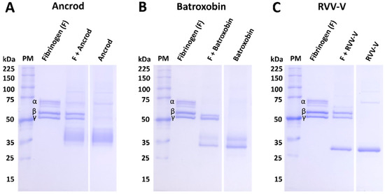 The protein profiles of the purified recombinant toxins and their activity on human fibrinogen. Degradation SDS-PAGE gel electrophoretic profiles (reduced conditions, 8% gel) displaying the fibrinogenolytic activity of the recombinant toxins (3 μg, 1 mg/mL) following their incubation with human fibrinogen (3.75 µg, 2.5 mg/mL) at 37 °C for 120 min: (A) ancrod, (B) batroxobin and (C) RVV-V. PM represents the molecular mass protein marker, and the α, β and γ chains of fibrinogen are highlighted by corresponding labels.