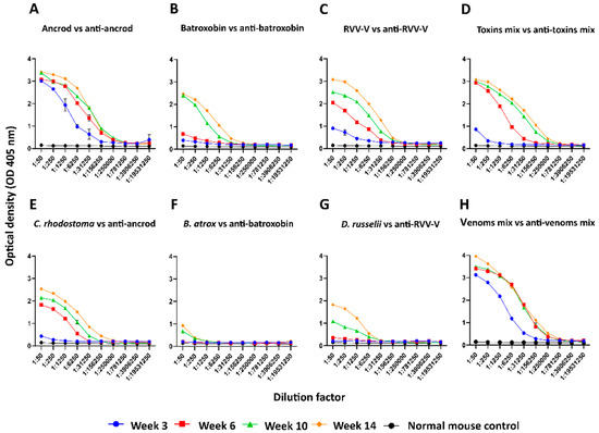 Time-course analysis of the immunological cross-reactivity of pooled sera to the recombinant toxins and crude venoms used as immunogens over 14 weeks of murine immunisation. (A) Responses of anti-ancrod pooled mice sera against ancrod; (B) anti-batroxobin sera against batroxobin; (C) anti-RVV-V sera against RVV-V; (D) anti-toxin mix sera against a 1:1:1 mixture of the three recombinant toxins; (E) anti-ancrod sera against C. rhodostoma venom; (F) anti-batroxobin sera against B. atrox venom; (G) anti-RVV-V sera against D. russelii venom; (H) antivenom mix sera (positive control) against a 1:1:1 mixture of the three crude venoms. Data is shown for sera collected at weeks 3, 6, 10 and 14 (end of the experiment) of the immunisation time course. Non-immunised mouse sera (“normal mice control”) was used as a negative control. All mice serum samples were standardised to 1:50, then diluted fivefold. Data points represent means of duplicate readings, and error bars represent the standard deviation (SD).
