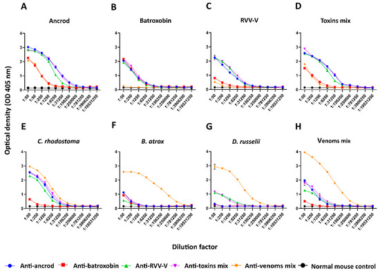 EPT-ELISA analyses of immunological binding between the experimental antivenoms and the recombinant toxins and crude venoms used as immunogens. Each resulting experimental antivenom (anti-ancrod, anti-batroxobin, anti-RVV-V, anti-toxin mix and antivenom mix) is coloured differently, and their binding to the various toxin and venom immunogens are displayed in different panels, alongside data obtained with the normal mouse control negative control. Data shown represents binding levels to: (A) ancrod, (B) batroxobin, (C) RVV-V, (D) a mixture of the three recombinant toxins, (E) C. rhodostoma venom, (F) B. atrox venom, (G) D. russelii venom, and (H) a mixture of the three venoms. Each antivenom sample was serially diluted fivefold in duplicate, with data points representing means of duplicate readings, and error bars representing standard deviations (SD).