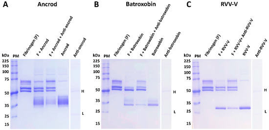 Experimental antivenoms directed against recombinant SVSP toxins inhibit their fibrinogenolytic activity. Degradation SDS-PAGE gel electrophoretic profiles are displayed following the incubation of various samples at 37 °C for 120 min. Panels show different data obtained with the different recombinant toxins: (A) Ancrod, (B) Batroxobin and (C) RVV-V. For each, the following layout was used: Lane 1, protein marker (PM); Lane 2, human fibrinogen (3.75 µg, 2.5 mg/mL); Lane 3, fibrinogen (3.75 µg, 2.5 mg/mL) + recombinant toxin (3 μg, 1 mg/mL; ancrod, batroxobin or RVV-V); Lane 4, fibrinogen (3.75 µg, 2.5 mg/mL) + recombinant toxin (3 μg, 1 mg/mL) + experimental antivenom (1.75 µg,1 mg/mL; anti-ancrod, anti-batroxobin or anti-RVV-V); Lane 5, recombinant toxin only (3 μg, 1 mg/mL); Lane 6, specific experimental antivenom only (1.75 μg, 1 mg/mL): H represents IgG heavy chain (≈50 kDa) and L IgG light chain (≈25 kDa).