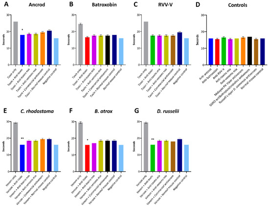 Inhibition of coagulation disturbances defined by the prothrombin time (PT). The assay measured the combined effect of the clotting factors of the extrinsic and common coagulation pathways (in seconds) in the presence of the recombinant toxins/crude venoms, and their recovery effect by adding specific experimental antivenoms/specific commercial antivenoms, incubated with FFP. (A) Ancrod, (B) Batroxobin, (C) RVV-V, (D) the experimental/commercial antivenoms controls and the normal mouse control, (E) C. rhodostoma venom, (F) B. atrox venom and (G) D. russelii venom. For each toxin/venom, “homologous” antivenom combinations were used (e.g., for ancrod the anti-ancrod antivenom was used as the anti-toxin antivenom, and the Malayan pit viper antivenom was used as the commercial antivenom). Each experimental antivenom alone, each commercial antivenom alone and the normal mouse control alone were used as negative controls. Error bars represent the standard deviation (SD) of duplicate measurements. The resulting data were statistically analysed with one-way ANOVA and Dunnett’s multiple comparison test. Values found to be significantly different to the venom + normal mouse control are indicated by asterisks: * p ≤ 0.05, ** p ≤ 0.01.