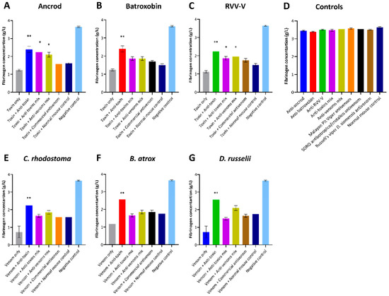 Quantification of fibrinogen concentrations following co-incubation of recombinant toxins and crude venoms with the specific experimental and commercial antivenoms and human plasma. The assay uses an excess of thrombin to convert fibrinogen to fibrin in diluted citrated human fresh frozen plasma (FFP). The resulting fibrinogen concentration is shown for each recombinant toxin/crude venom against the specific experimental antivenoms incubated in FFP. Data shown represents the following immunogens: (A) Ancrod, (B) Batroxobin, (C) RVV-V, (D) the experimental/commercial antivenoms controls and the normal mouse control, (E) C. rhodostoma venom, (F) B. atrox venom and (G) D. russelii venom. For each toxin/venom, “homologous” antivenom combinations were used (e.g., for ancrod the anti-ancrod antivenom was used as the anti-toxin antivenom, and the Malayan pit viper antivenom was used as the commercial antivenom). Each experimental antivenom alone, each commercial antivenom alone and the normal mouse control alone were used as negative controls. Error bars represent the standard deviation (SD) of duplicate measurements. The resulting data were statistically analysed with one-way ANOVA and Dunnett’s multiple comparison test. Values found to be significantly different to the venom + normal mouse control are indicated by asterisks: * p ≤ 0.05, ** p ≤ 0.01.