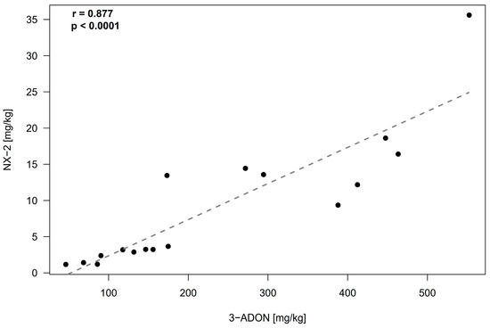 Relationship (Pearson correlation) between NX-2 and 3-ADON concentrations in rice cultures of F. culmorum. Each culture (Table 1) is represented by a single data point (black dots). Isolate 59.6st, which was assigned to the NIV chemotype, and isolates 227.2 and IPP0999, in which the concentrations of NX-2 were below the limit of detection, were excluded.
