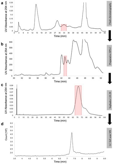 Purification of NX-2 toxin from rice culture of F. culmorum 240.2sp. Three-week-old rice cultures were extracted with methanol/water/acetic acid and putative NX-2 was enriched by chromatography on a C18 cartridge (a), polar-modified C18 column (b), and Sephadex LH-20 (c). The purity of the metabolite was established by HPLC-MS in a full-scan mode (d). Red boxes mark fractions collected for purification.