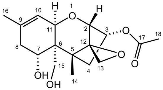 Putative NX-2 accumulating in rice cultures of F. culmorum was originally identified by comparing its retention time in HPLC and MS/MS fragmentation with data obtained with purified NX-2 from Prof. Franz Berthiller (BOKU, Vienna, Austria). Because the production of NX-2 by F. culmorum has not been reported before and an isomer of NX-2 could possess the same retention time and generate product ions with the same m/z values, we purified putative NX-2 from rice cultures of F. culmorum 240.2sp (Figure 2) to verify its structure. Approximately 5 mg of pure metabolite was obtained from 480 g of dry rice culture (see Section 5.4 for details).