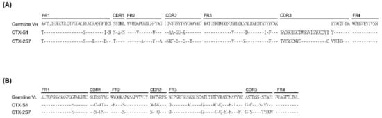Amino acid sequence alignment of selected anti-CTX scFvs. Amino acid sequences of scFv were deduced from gene sequences. (A) VH and (B) VL domains of anti-CTX scFv aligned with the corresponding domains in the hen germline.
