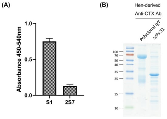 The ability of the two scFvs to bind to CTX was evaluated by indirect ELISA. The ELISA signal of S1 was found to be five times higher than that of 2S7 (Figure 3A), indicating that S1 has higher neutralization potential against CTX-induced toxicity. Therefore, S1 was selected for large scale purification and further investigation. In addition, polyclonal anti-CTX IgY was precipitated from egg yolks of CTX-immunized hens by dextran sulfate. SDS-PAGE analysis of purified polyclonal anti-CTX IgY showed protein bands corresponding to the heavy and light chains of IgY, with molecular weights (MW) of about 70 kDa and 25 kDa, respectively, whereas SDS-PAGE of purified S1 scFv showed a dominant protein band of MW between 25 to 35 kDa, equal to the predicted MW of scFv with a short linker (~28 kDa) (Figure 3B).