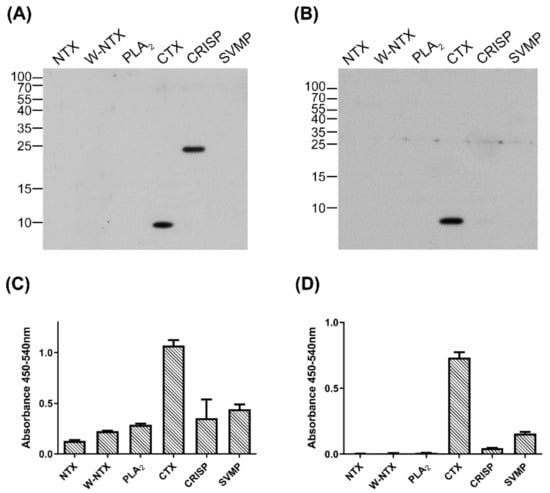 Venom proteins (10 ng per well) were coated onto 96-well polystyrene microplates (Corning Inc., Corning, NY, USA) by incubating at 4 °C overnight and then blocked with 1% BSA at room temperature (RT) for 1 h. After blocking, the plate was washed with PBST six times, and dilution of anti-CTX antibodies (1:5000) were added to each well and incubated at RT for 1 h. Afterward, the plate was washed with PBST six times and incubated with related secondary antibodies, respectively, at RT for 1 h. After washing with PBST six times, 50 μL of TMB buffer (Clinical Science Products Inc., Mansfield, MA, USA) was added into each well and incubated at RT for 10 min. The reaction was stopped with 25 μL H2SO4, and absorbance of each well measured with a SpectraMax M5 microplate reader (Molecular Devices, San Jose, CA, USA) at excitation and emission wavelengths of 450 and 540 nm, respectively.